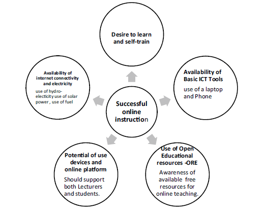 Importantly, we see that the success of online teaching in an EdTech low-resourced university depends on the lecturers’ desire to learn, the availability of essential ICT devices, the use of open educational resources-OER, the potential of the use of devices and the availability of internet connectivity. However, intermittent internet connectivity, student absenteeism, a lack of primary ICT devices, and EdTech illiteracy persist. External support—such as continuous professional development programs (CPDs), import duty exemptions or corporate sponsorships and donations—should be sought to facilitate online lessons.